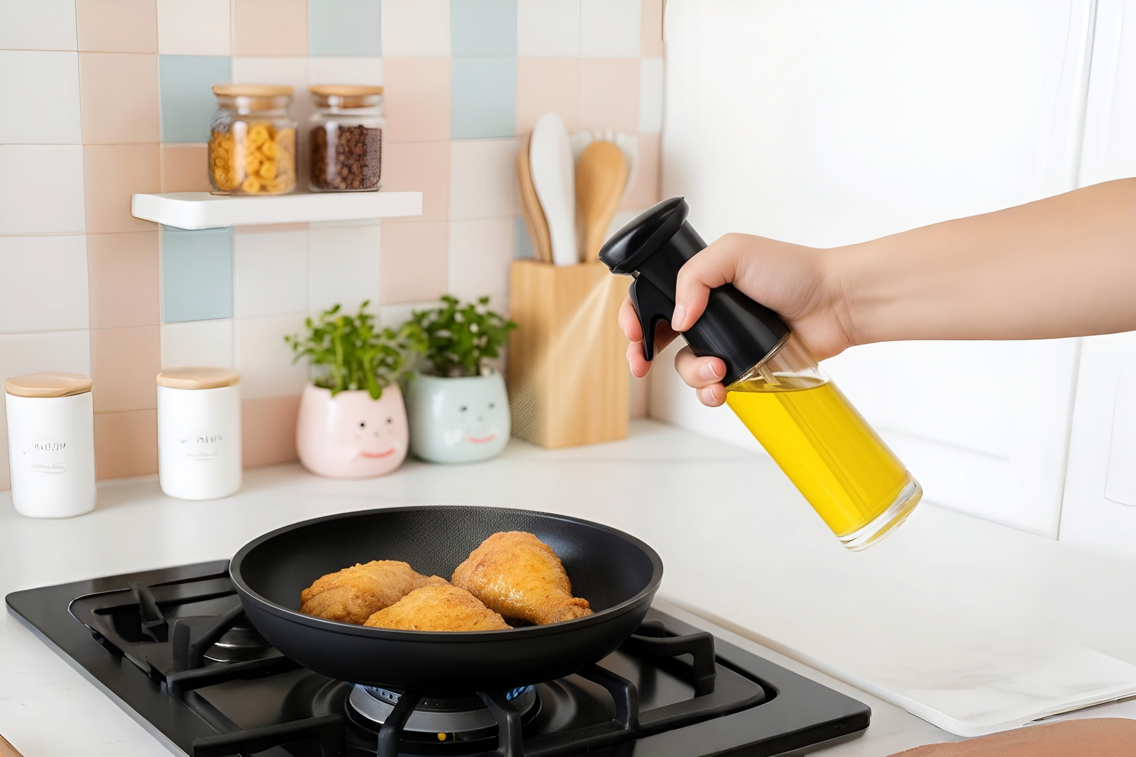 "A refillable glass sprayer that evenly mists oil for cooking, baking, grilling, salads, and air fryers"