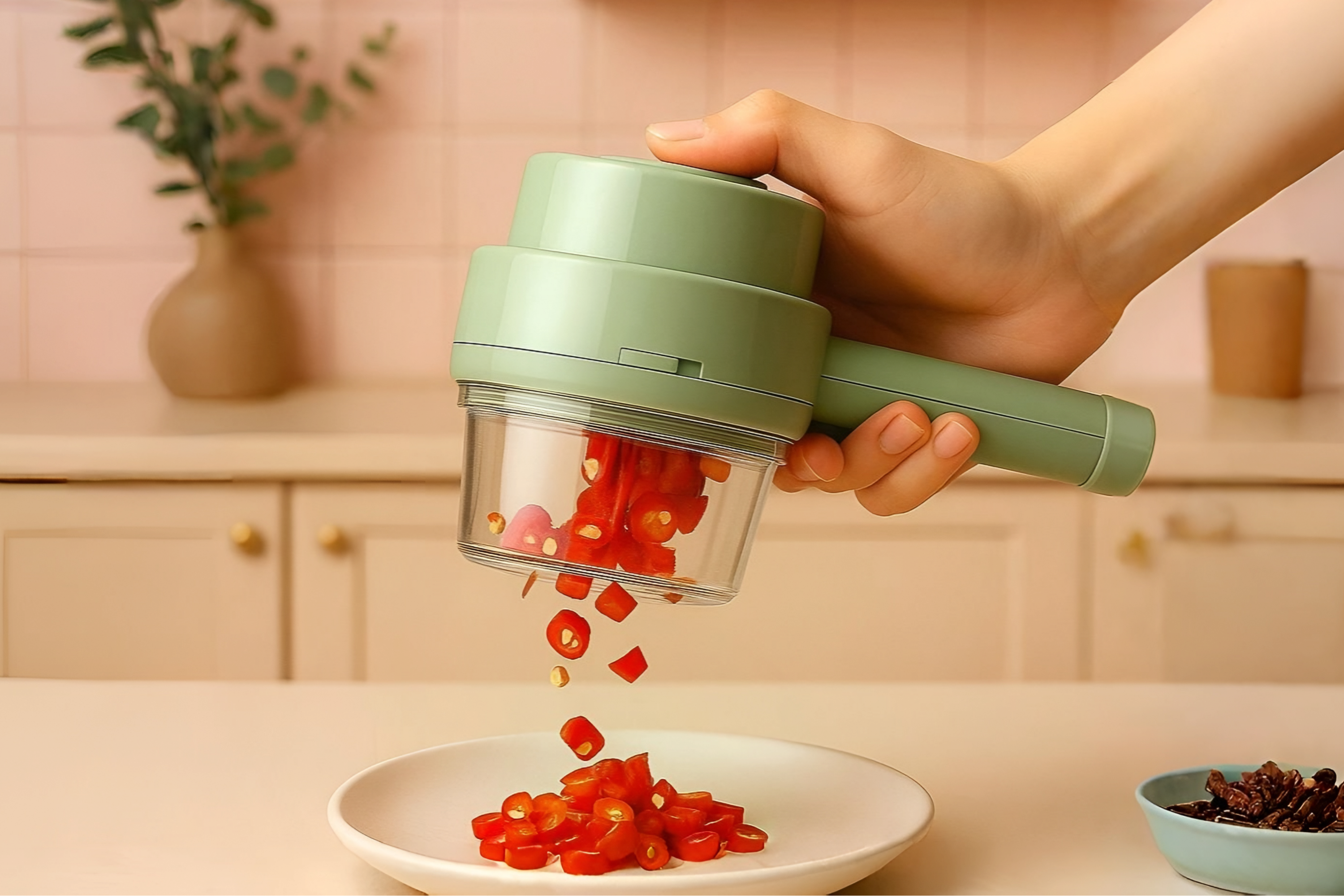 A compact USB rechargeable chopper that quickly minces garlic, fruits, and vegetables with ease.